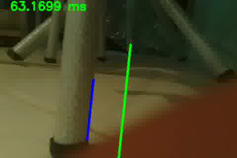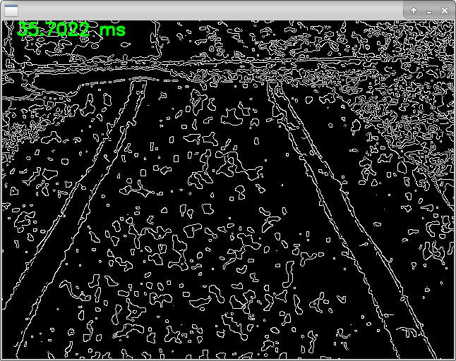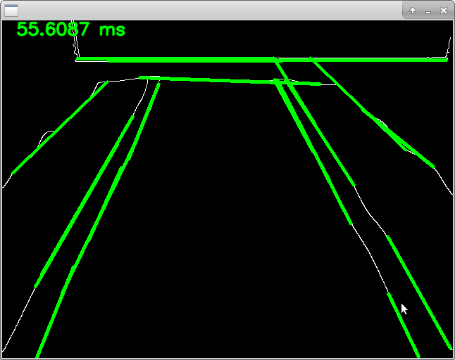 Vec4d LineDetector::detectLine(frame_ref src, frame_ref dest) { GaussianBlur(src, src, Size(Settings::kernelSize, Settings::kernelSize), 4); Ptr<CLAHE> clahe = createCLAHE(2.); vector<Mat> channels; split(src, channels); for (auto& c : channels) { clahe->apply(c, c); } merge(channels, src); Mat gray(src.size(), CV_8UC1); filterColors(src, gray); Mat mask(src.size(), CV_8UC1); Canny(gray, mask, Settings::lowThreshold, Settings::highThreshold, 3, true); cvtColor(mask, dest, COLOR_GRAY2BGR); vector<Vec4i> lines; HoughLinesP(mask, lines, Settings::rho, Settings::theta, Settings::houghThreshold, Settings::minLineLenght, Settings::maxLineGap); //here is where the direction algorithm, which will be shown below }