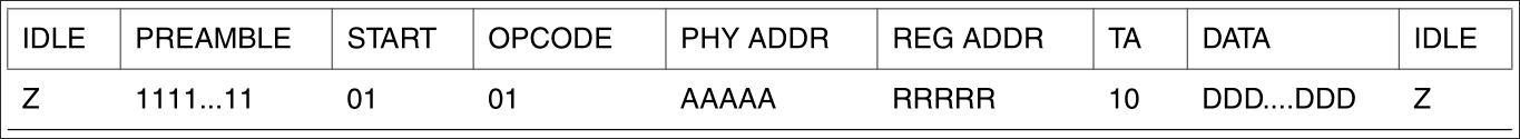 The read operation is similar. First, the MDIO base register is configured for reading; then, after waiting for operation completion, the data can be accessed in the MDIO data register.