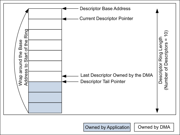 7. DMA initialization: The last step is to finish the descriptor ring buffer DMA initialization. Here, the DMA registers are configured for the operation of the reception and transmission rings. Lastly, the reception and transmission of packets are enabled.
