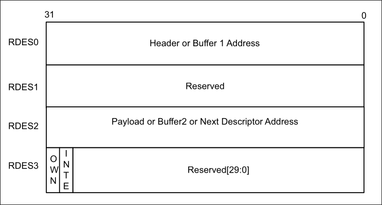 The reception of packets is handled by a thread. It will constantly iterate over the reception ring, checking the OWN bit of each descriptor. If the OWN bit is zero, the packet of that descriptor will be read by the system. The two images bellow depict the descriptor ring buffer and the reception descriptor.