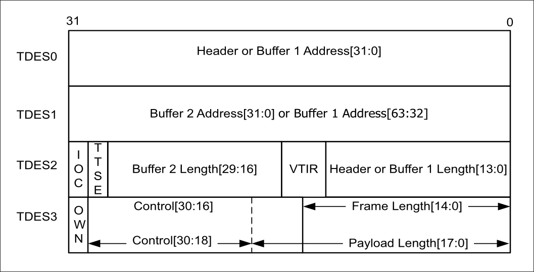 For transmission, a free transmission descriptor will be configured with the address of the packet and its length, and the OWN bit will also be set. Then, the transmission ring tail pointer will be incremented, and the DWMAC controller will begin transmission. The image bellow presents the structure of the transmission descriptor.