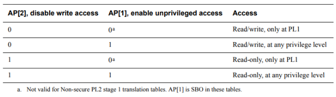 Quando este modelo de permissões é utilizado, se o bit AP0 for igual a 1, o modelo se torna igual a AP2:1. As permissões válidas para o modelo são descritas pela seguinte tabela: