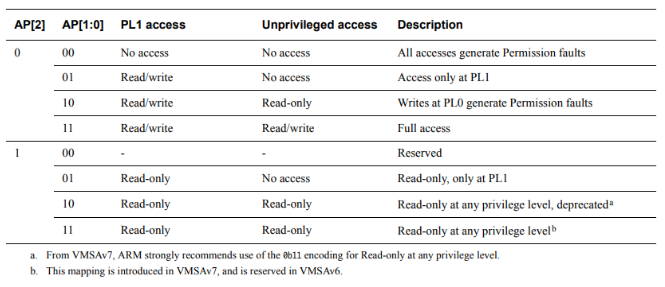 Os bits que controlam as permissões de acesso a uma memória correspondente estão em um descritor de tabela de tradução e são três, denominados de AP2:0. Para descritores curtos de segundo nível, sua localização está de acordo com a figura abaixo.