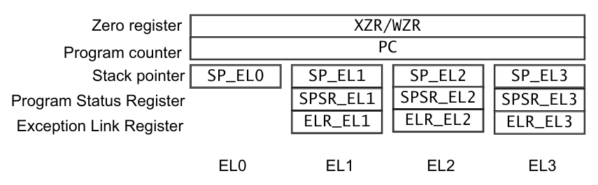 Teremos também um SP (Stack Pointer) para cada Exception Level. O PC (Program Counter) e o XZR/WZR (registrador zero) é o mesmo em todos os Exception Levels.