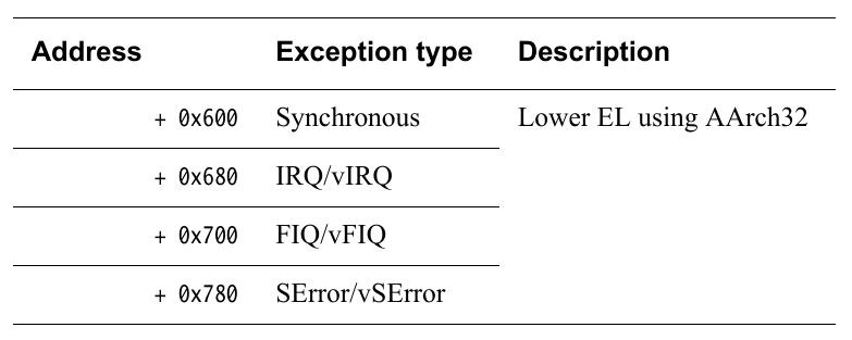 The address of the Vector Table changes from 64 and 32 bits modes. For 32 bits, the vector table is initially located at the address 0x00008000, and 0x00080000 for 64 bits.