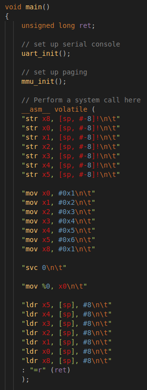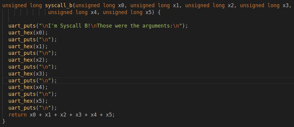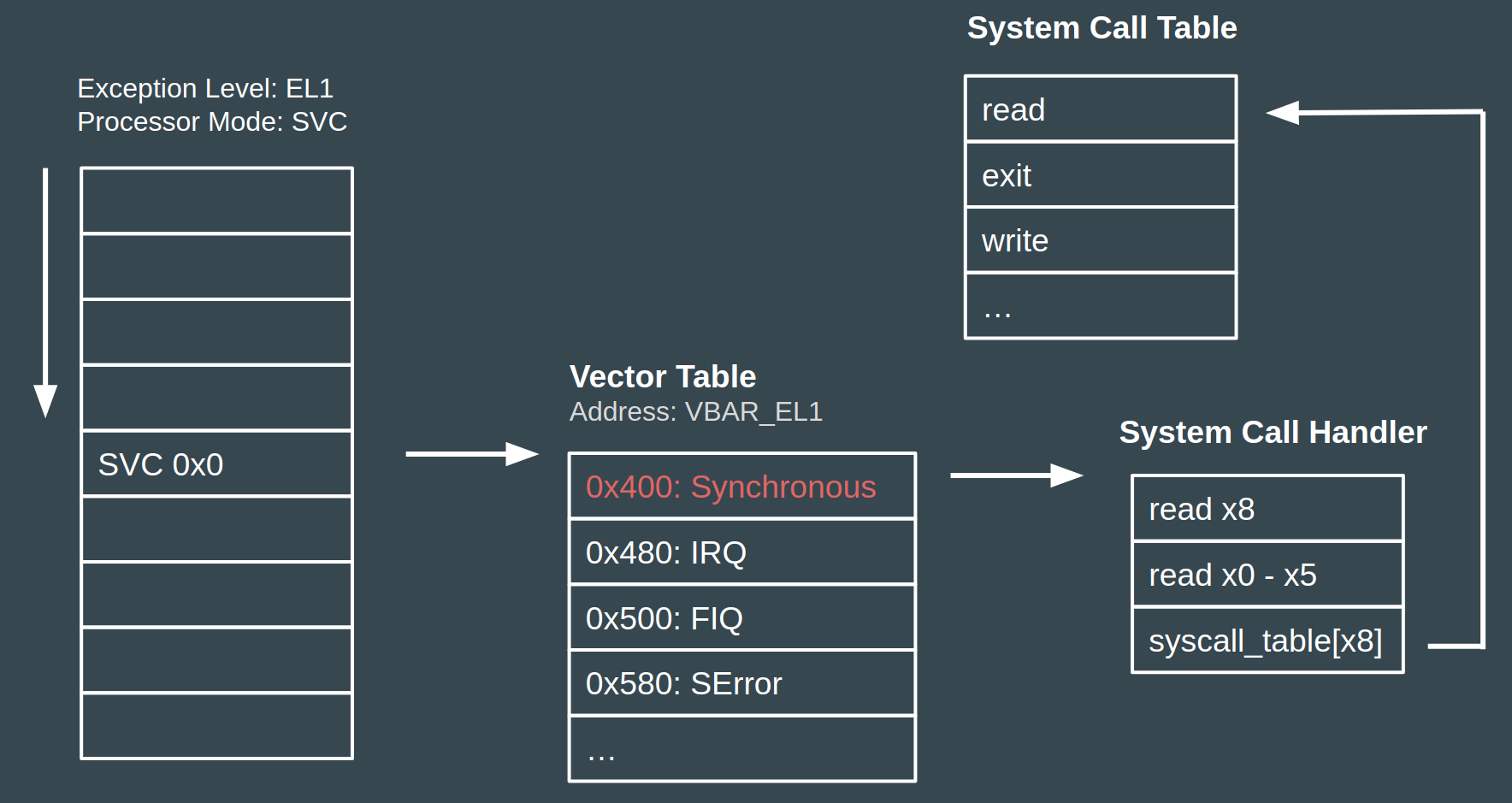 Uma forma de implementar uma syscall é forçar uma exceção de hardware que por sua vez irá chamar o tratador de interrupções/exceções. Algumas arquiteturas possuem instruções específicas para system calls, o que é o caso do ARMv8 que possui uma instrução chamada Supervisor Call (SVC) que irá executar o serviço do sistema operacional que foi requisitado.