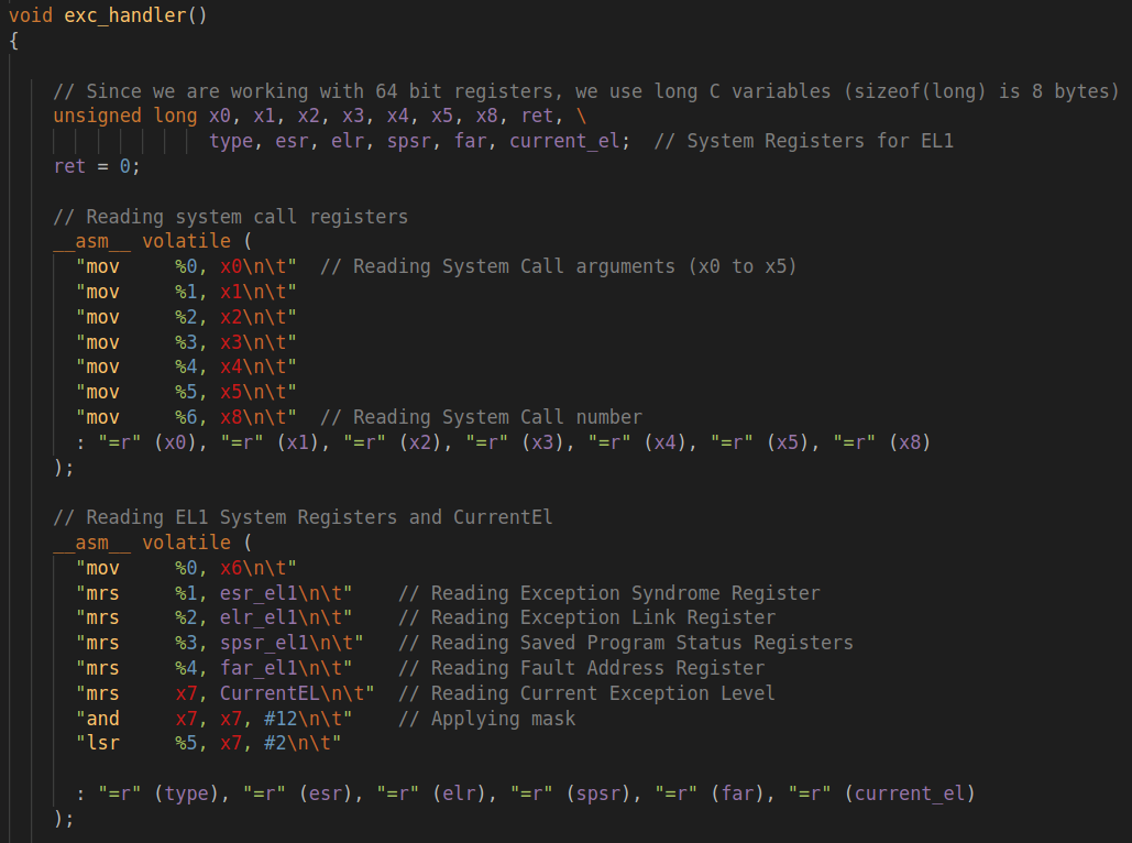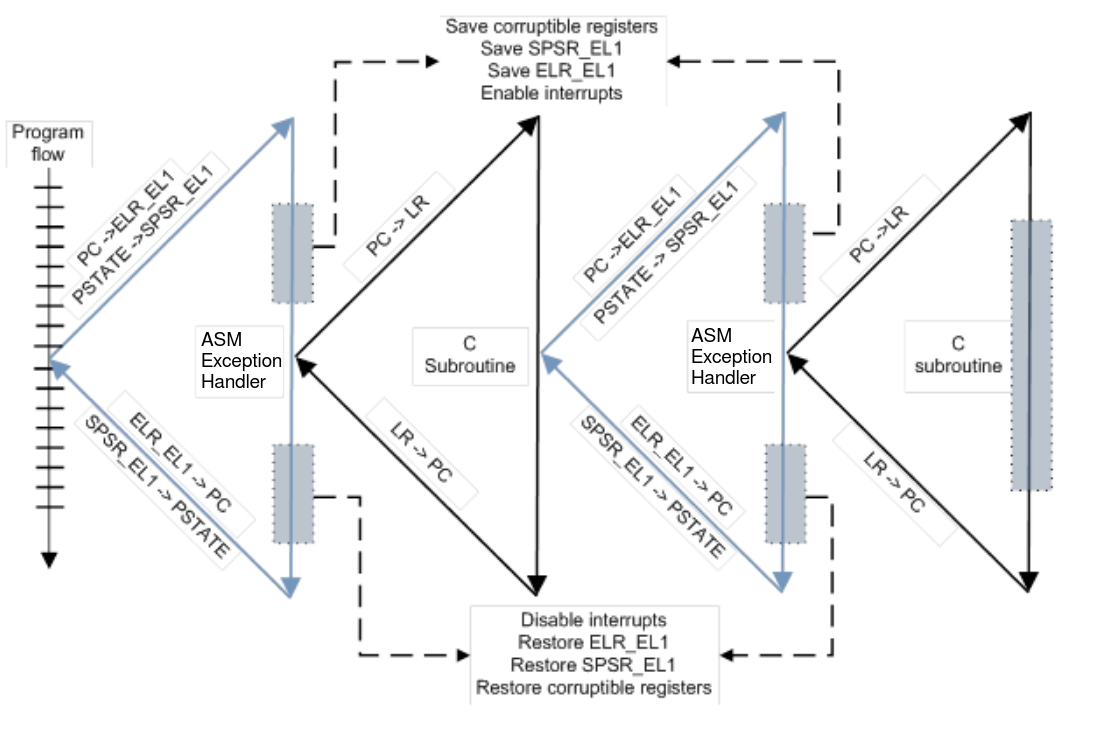 - EL1 agrega, tipicamente, o Kernel do sistema operacional, e portanto neste nível que serão executadas as system calls do SO. Visto que o espaço de usuário é em EL0 e as system calls estão em EL1, a aplicação precisa executar a instrução SVC (Supervisor Call) para provocar uma exceção síncrona e elevar o seu Exception Level para EL1.