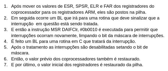 - ELR_ELn (Exception Link Register): armazena o endereço de retorno do nível em que ocorreu a exceção. Novamente teremos um desse registrador para EL com exceção do 0. Portanto o ELR_EL1 irá armazenar o endereço de retorno de uma exceção que ocorreu no EL0 e assim por diante