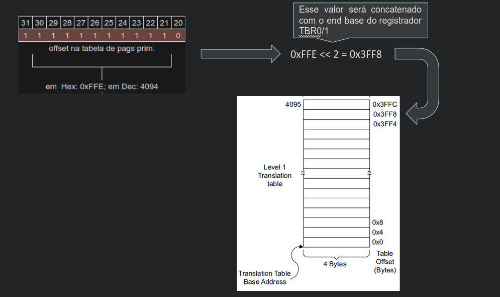 Qual das duas translation tables será usada depende dos bits mais significativos do endereço virtual. Se eles estiverem todos setados em 0, será selecionada a translation table apontada por TTBR0. Se eles estiverem todos setados em 1, será selecionada a translation table apontada por TTBR1.