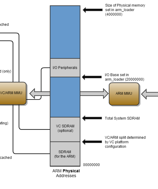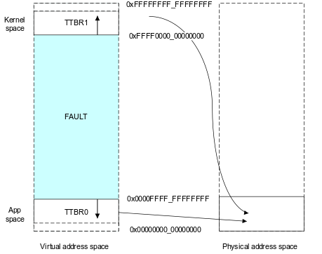 A figura abaixo mostra como o espaço do kernel (em TTBR1) é mapeado para a área mais significativa da memória e o espaço de endereço virtual associado a cada aplicativo (em TTBR0) é mapeado para a área menos significativa da memória. Porém, ambos são mapeados para um espaço de endereço físico muito menor, à direita.