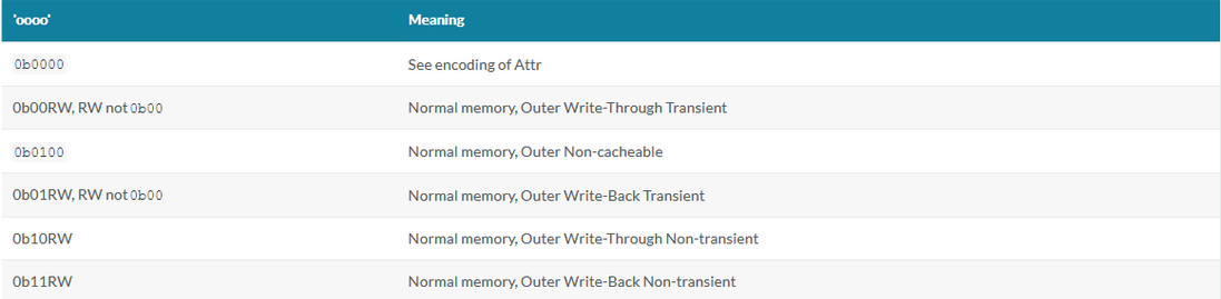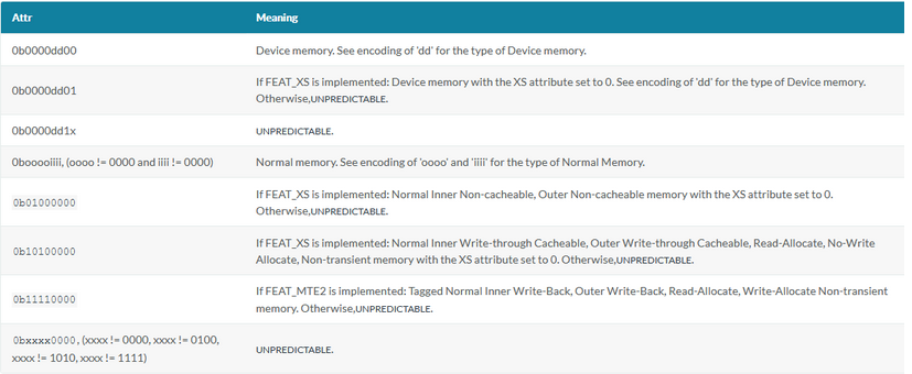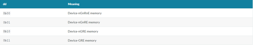 .equ Mode_USR, 0x10 .equ AArch32_Mode_USR, 0x10 .equ AArch32_Mode_FIQ, 0x11 .equ AArch32_Mode_IRQ, 0x12 .equ AArch32_Mode_SVC, 0x13 .equ AArch32_Mode_ABT, 0x17 .equ AArch32_Mode_UNDEF, 0x1B .equ AArch32_Mode_SYS, 0x1F .equ AArch32_Mode_HYP, 0x1A .equ AArch32_Mode_MON, 0x16 .equ AArch64_EL2_SP2, 0x09 // EL2h .equ AArch64_EL2_SP0, 0x08 // EL2t .equ AArch64_EL1_SP1, 0x05 // EL1h .equ AArch64_EL1_SP0, 0x04 // EL1t .equ AArch64_EL0_SP0, 0x00 .equ AArch32_State_Thumb, 0x20 .equ AArch32_State_ARM, 0x00 .equ TT_S1_TABLE, 0x00000000000000003 // NSTable=0, PXNTable=0, UXNTable=0, APTable=0 // TT block entries templates (L1 and L2, NOT L3) // Assuming table contents: // 0 = b01000100 = Normal, Inner/Outer Non-Cacheable // 1 = b11111111 = Normal, Inner/Outer WB/WA/RA // 2 = b00000000 = Device-nGnRnE .equ TT_S1_FAULT, 0x0 .equ TT_S1_NORMAL_NO_CACHE, 0x00000000000000401 // Index = 0, AF=1 .equ TT_S1_NORMAL_WBWA, 0x00000000000000405 // Index = 1, AF=1 .equ TT_S1_DEVICE_nGnRnE, 0x00600000000000409 // Index = 2, AF=1, PXN=1, UXN=1 .equ TT_S1_UXN, (1 << 54) .equ TT_S1_PXN, (1 << 53) .equ TT_S1_nG, (1 << 11) .equ TT_S1_NS, (1 << 5) .equ TT_S1_NON_SHARED, (0 << 8) // Non-shareable .equ TT_S1_INNER_SHARED, (3 << 8) // Inner-shareable .equ TT_S1_OUTER_SHARED, (2 << 8) // Outer-shareable .equ TT_S1_PRIV_RW, (0x0) .equ TT_S1_PRIV_RO, (0x2 << 6) .equ TT_S1_USER_RW, (0x1 << 6) .equ TT_S1_USER_RO, (0x3 << 6)