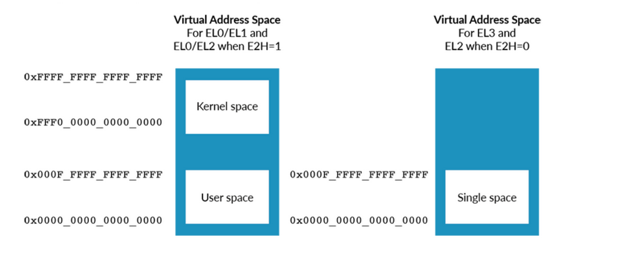 Algo a se observar é que EL2 e EL3 têm TTBR0, mas não têm TTBR1. Portanto, se EL2 estiver usando AArch64, ele só pode usar endereços virtuais no intervalo de 0x0 a 0x0000FFFF_FFFFFFFF. O mesmo se aplica para EL3 usando AArch64.