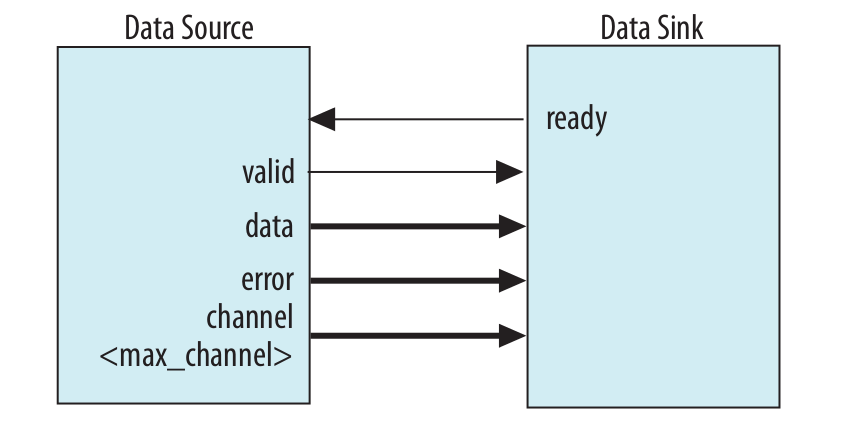 The Avalon Streaming protocol is a way to implement the dataflow model of computation. This protocol implements the communication betweent two blocks, one is the producer (Source) and the other is the consumer (Sink). The protocol has three mandatory signals: