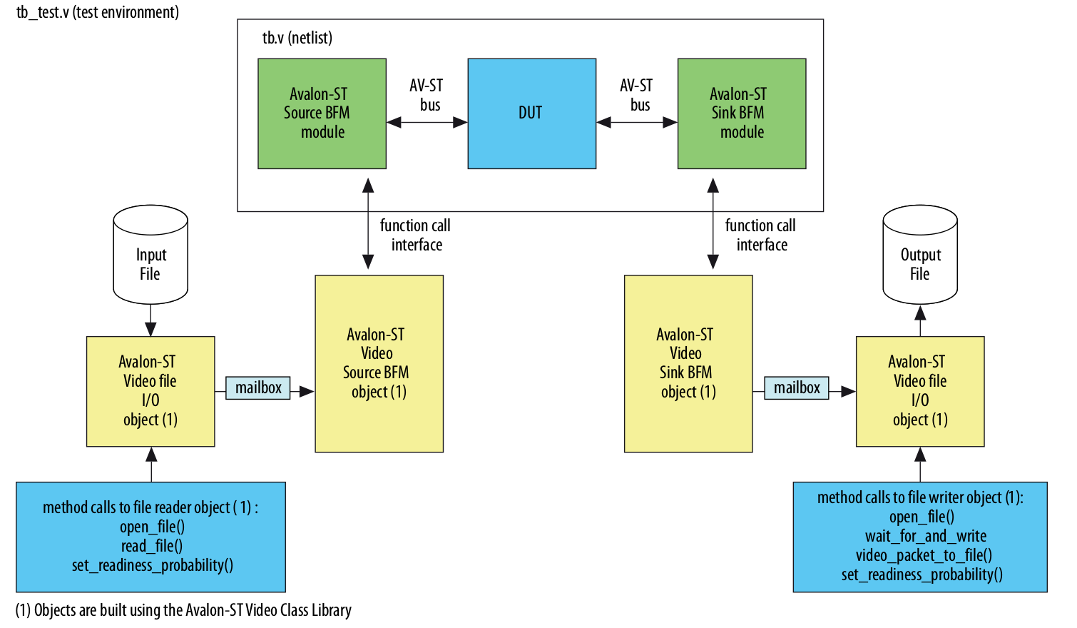 Using this testbench it is possible to verify if an IP follows correctly the avalon streaming protocol and the VIP packet definitions. The testbench works by loading a video file from disk, inserting pixel by pixel in the DUT, and saving the output in another video file. The testbench provides lots of options to test the DUT against invalid data, bad timing and other problems that may appear.